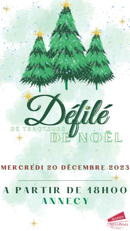 Les Jeunes Agriculteurs de Haute-Savoie vous donnent rendez-vous le mercredi 20 décembre 2023 à partir de 18h00 pour un défilé de Noël au coeur de la ville d'Annecy.