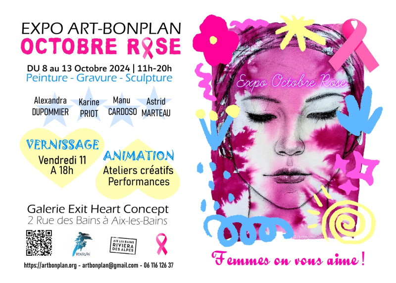 Venez célébrer la femme avec 4 artistes du collectif Art-Bonplan à l'occasion d'Octobre Rose du 8 au 13 octobre 2024, vernissage vendredi 11 à 18h à la galerie Exit Heart Concept, 2 rue des Bains à Aix-les-Bains