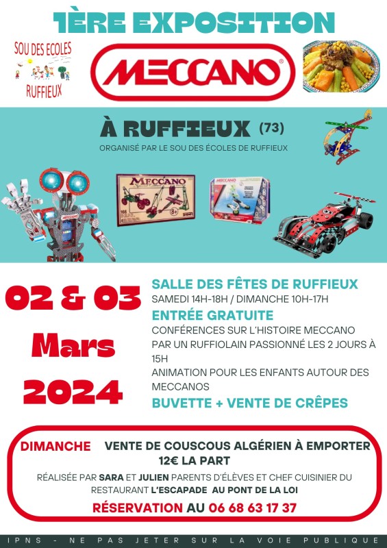L'association du sou des écoles de Ruffieux organise les 2 et 3 mars prochains une exposition de Meccano, en partenariat avec un habitant passionné. Celle-ci aura lieu tout le week-end à la salle polyvalente, l'entrée sera gratuite. Une buvette avec vente de crêpes au profit de l'association sera proposée.