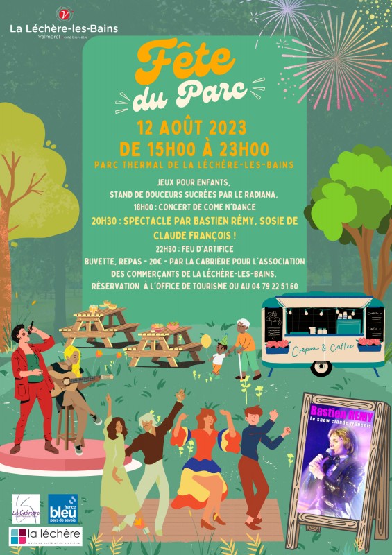 Au programme : - Goûter organisé par le restaurant l'O à la bouche - Jeux pour enfants - Concert par Come N'Danse à 18h - Repas servi par La Cabrière (Sur réservation à l'Office de tourisme de préférence) à partir de 19h - Spectacle par Bastien Rémy, sosie de Claude François vers 20h30. - Feu d'artifice tiré au Village 92 vers 22H30. Menu : Couscous - Fromage de Savoie - Tarte aux fruits. Buvette par l'association des commerçants de La Léchère-les-Bains.