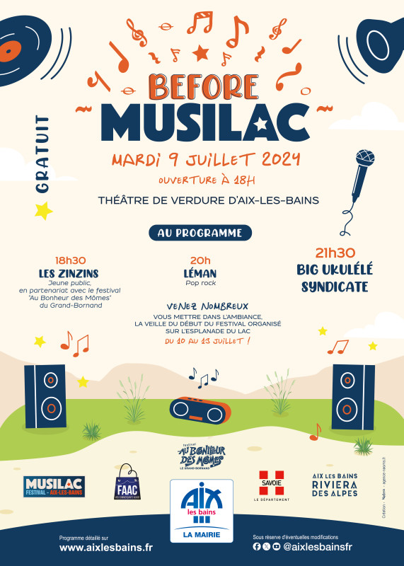 Gratuit et ouvert à tous, le Before de Musilac est organisé le mardi 9 juillet 2024 au Théâtre de Verdure par la Ville d’Aix-les-Bains en partenariat avec Musilac, la Fédération aixoise des artisans et commerçants, le Département de la Savoie et l’Office de tourisme intercommunal Aix-les-Bains Riviera des Alpes.
