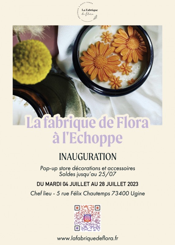 Retrouvez-là dès le mardi 4 juillet, 10h00 au 5 rue Félix Chautemps 73400 Ugine, pour célébrer l’ouverture ! ? Si vous souhaitez la découvrir en avant première, retrouvez-là sur ses réseaux sociaux la_fabrique_de_flora ou via son site internet lafabriquedeflora.fr