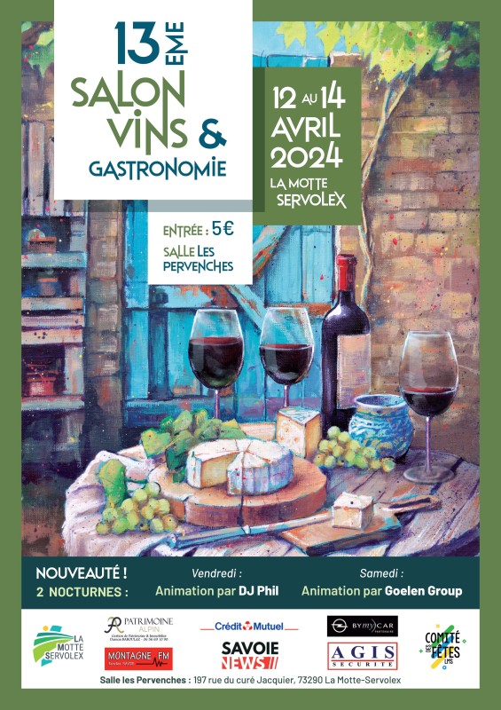 Nocturne du vendredi 12 avril soir Salle les pervenches (197 rue curé jacquier à la motte servolex) Salon intérieur de 17h à 22h 55 exposants, viticulteurs de la France entière, Italie, Allemagne, Portugal et Moldavie, Alcools forts et Producteurs de produits gourmands exceptionnels Extérieurs, Buvette de 17h à 23k Scène musicale de 20h à 23h animée par DJ Phil Restauration Moule frites du CDF sur réservation au 0636789961 avant le 27 mars Food Truck Nuggets et Diots Polenta au Chaudron, Huitres du soleil Samedi 13 avril de 10h à 20h buvette et restauration (Food Truck Crepes, Cuisine traditionnelle, escargots préparés, huitres Diots Polenta, Food Truck Nuggets) jusqu'à 23h Scène Musicale animée par Goelen Group de 20h à 23h Dimanche 14 avril de 10h à 17h Entrée 5€ ou 3€ avec Pass privilege