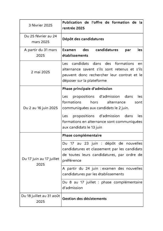 Dans le cadre des formations en alternance, une période est désormais dédiée à la recherche du contrat par les candidats, à son dépôt sur la plateforme et à sa validation par l’établissement. Cette période se déroulera du 2 mai au 12 juin, et les candidats ne recevront leurs premières propositions d’admission qu’à l’issue de cette période.