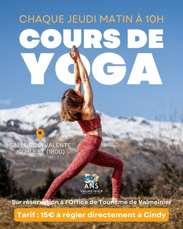 COURS DE YOGA Tous les jeudis matins à 10h en salle polyvalente (21,28/03 et 4 et 11/04). -Tarif : 15€/pax à régler directement à Cindy -Inscriptions à l’OT Type de yoga : Hatha vinyasa yoga (dynamique et basé sur la respiration) - Durée de la séance : 1H