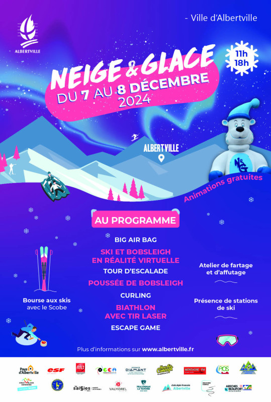 Le festival Neige & Glace rassemblent des activités de découverte et promotion des sports d'hiver. L’accès aux animations est gratuit : Big Air Bag, Ski et bobsleigh en réalité virtuelle, tour d’escalade, poussée de bobsleigh, curling, tir laser comme au biathlon, escape game… En plus, Marie Bochet sera en dédicace le samedi de 14h30 à 16h30 au stand du club Handisport.