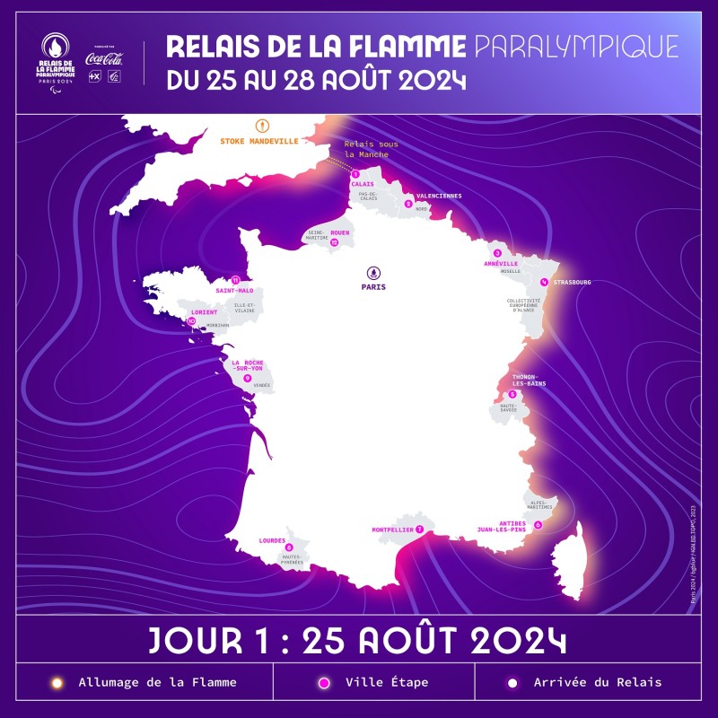 Douze relais simultanés à travers le pays convergeront vers Paris, jusqu'à la cérémonie d'ouverture des Jeux paralympiques le 28 août 2024.
